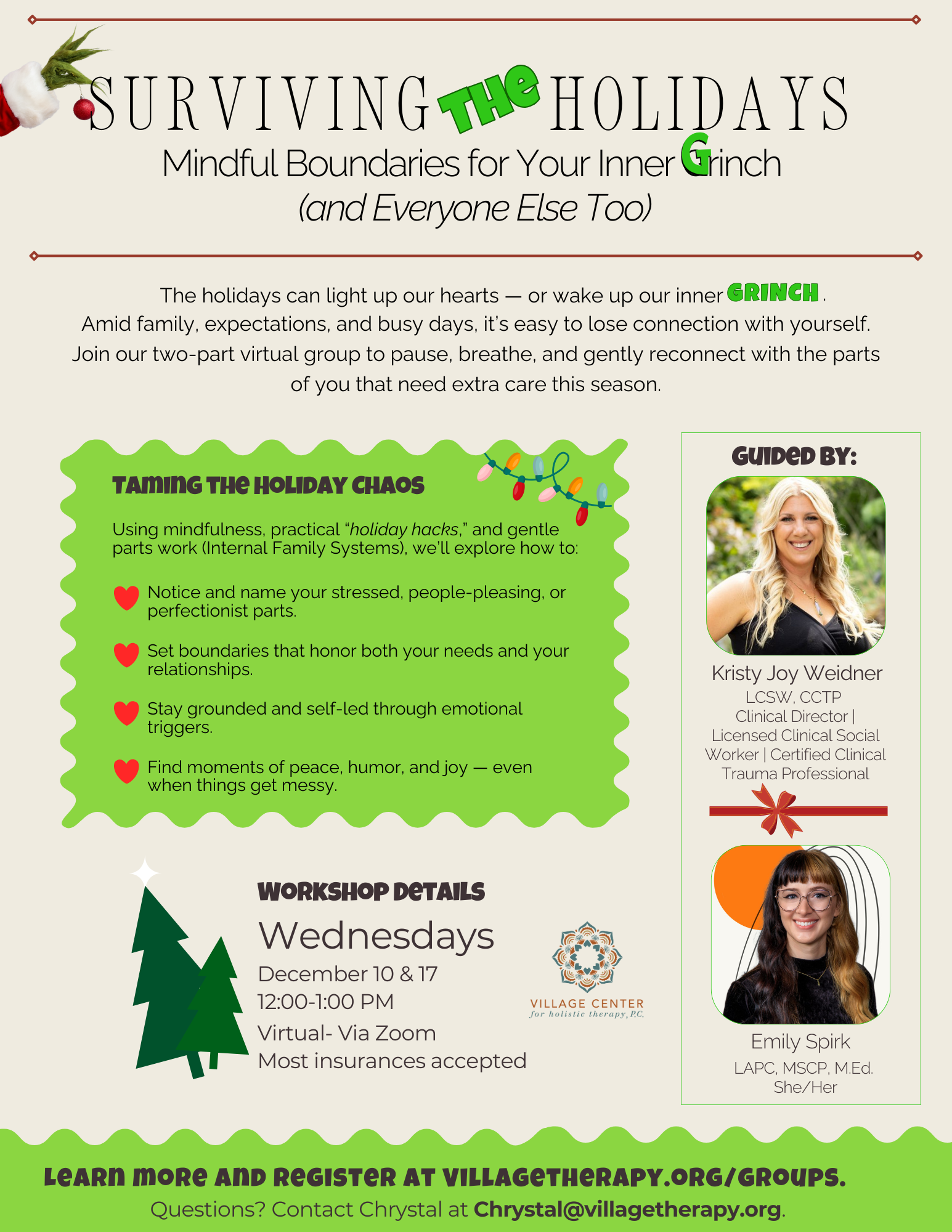 Please note: If you are new to the Center, you’ll need to complete a one-time intake assessment prior to your first group session. (Intake assessments are not needed for our Community Classes or Workshops.) Please use our contact form to inquire about our groups. We accept some (but not all) insurances for groups services.