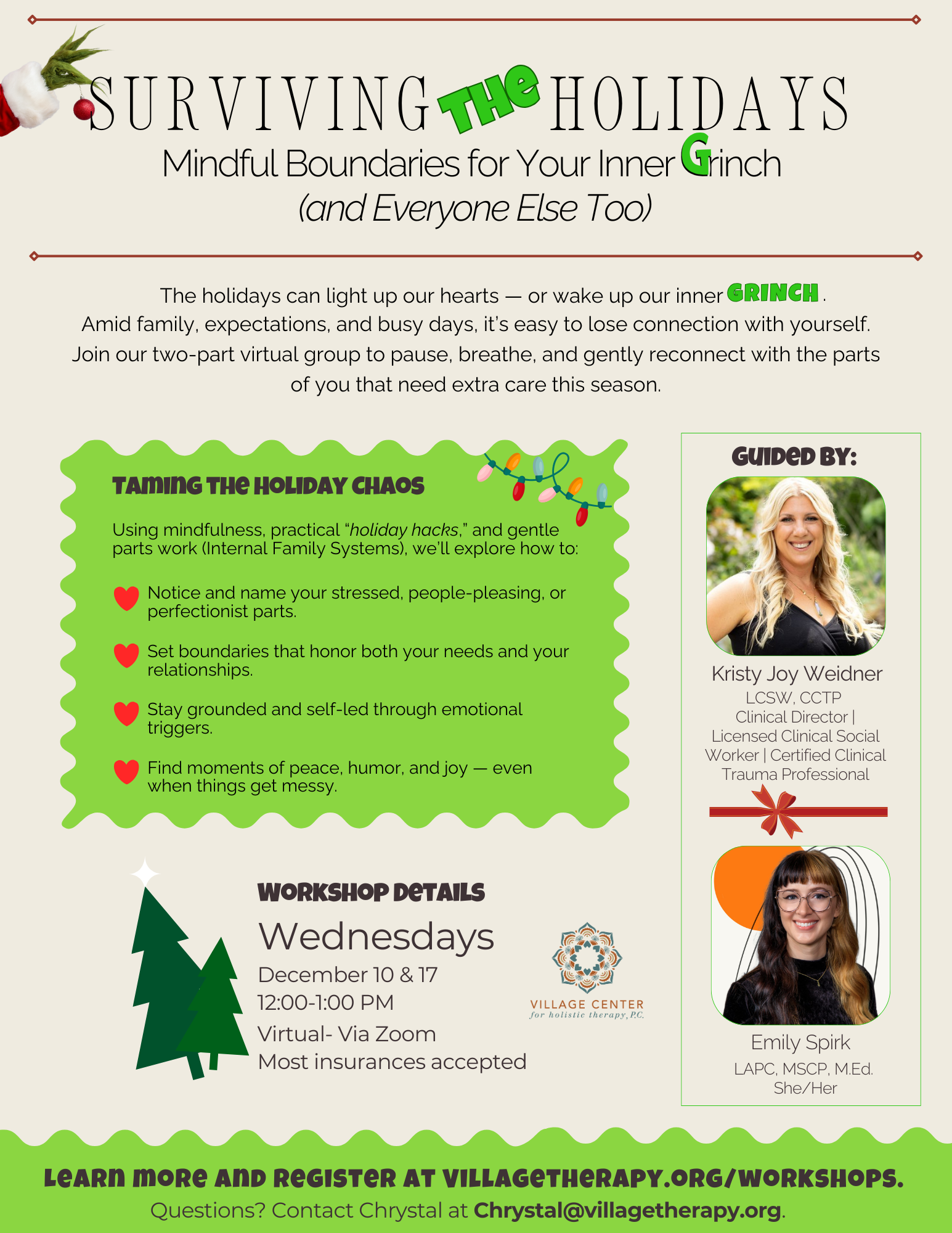 Come as you are. Leave feeling centered, supported, and more at ease this holiday season. Contact Chrystal for details at Chrystal@villagetherapy.org.